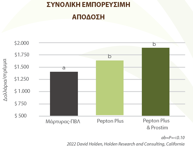 - Οι εφαρμογές με Pepton Plus και Pepton Plus & Prostim παρόμοια αύξησαν σημαντικά: – Τα έσοδα του καλλιεργητή ανά στρέμμα ήταν σημαντικά αυξημένα με βάση τις τιμές της φράουλας:+18,8% για το Pepton Plus, 29,6% για το Pepton Plus/Prostim – Τα εμπορεύσιμα κιβώτια: +17% για το Pepton Plus, +30% για το Pepton Plus/Prostim – Το ποσοστό των εμπορεύσιμων κιβωτίων συνολικά: 65% για το Pepton Plus, 68% για το Pepton Plus/Prostim και 56% για τον μάρτυρα